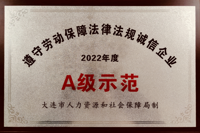 我公司獲評“大連市2022年度勞動保障守法誠信A級示范企業(yè)”。企業(yè)勞動保障守法誠信等級評價是由人力資源社會保障行政部門根據(jù)企業(yè)遵守勞動保障法律、法規(guī)和規(guī)章的情況來評定的,每年評定一次?!癆級示范企業(yè)”為最高等級。我公司一直注重誠信守法經(jīng)營,構(gòu)建和諧勞動關(guān)系,已連續(xù)多年獲得該項榮譽。