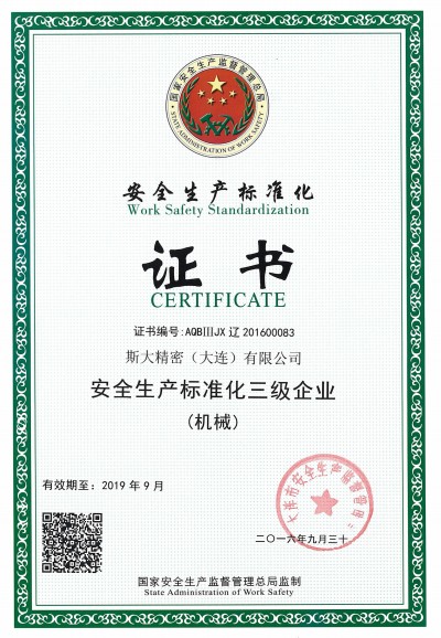 2016年9月30日,斯大精密(大連)有限公司再次獲得大連市安全生產(chǎn)監(jiān)督管理局頒發(fā)的安全生產(chǎn)標(biāo)準(zhǔn)化三級企業(yè)證書。此次證書是原有證書3年到期復(fù)審合格后的再次頒發(fā)。我公司從2012年開展安全生產(chǎn)標(biāo)準(zhǔn)化工作,并于當(dāng)年取得安全生產(chǎn)標(biāo)準(zhǔn)化三級企業(yè)證書。此次復(fù)審依據(jù)《機(jī)械制造企業(yè)安全標(biāo)準(zhǔn)化考核評級標(biāo)準(zhǔn)》及公司相關(guān)管理規(guī)定在基礎(chǔ)管理、電氣、設(shè)備、設(shè)施、作業(yè)環(huán)境、職業(yè)健康等方面按照嚴(yán)格的審核標(biāo)準(zhǔn)實施考評的情況下得到了高度評價,通過了大連市安全生產(chǎn)監(jiān)督管理局的最終審核。