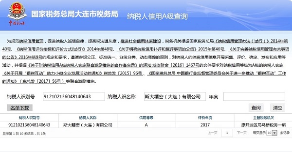 我公司被國家稅務總局大連市稅務局評選為大連市“2017年A類納稅人”。A類納稅人不僅是企業(yè)誠實守信,按章納稅的證明,而且還可享有兩年內(nèi)免除稅務稽查,優(yōu)先辦理各項涉稅事宜等優(yōu)惠待遇。